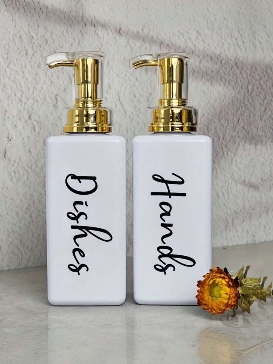 2 pièces Distributeur de savon pour les mains et la vaisselle dans l'évier ou sur le plan de travail de la cuisine, contenant de 500 ml pour le liquide vaisselle, avec pompe, carré doré, blanc et transparent (avec étiquette)