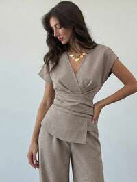 AloruhAloruh Ensemble nouvelle arrivée printemps/été, tenue élégante de villégiature, chemise en lin abricot à manches asymétriques et taille froncée, pantalon large taille haute en bambou lin abricot, ensemble chemise et pantalon à taille froncée et ourlet asymétrique, convient pour toutes les saisons, élégant pour le travail, la sortie quotidienne, les occasions décontractées, la cérémonie de remise des diplômes, la fête des enseignants, la rentrée scolaire et autres occasions.