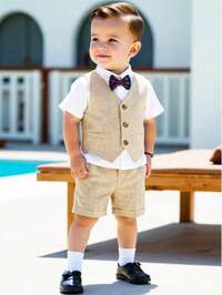 Fern GlowSHEIN 3 pièces Ensemble de tenue de gentleman pour bébé garçon, body blanc à manches longues, gilet gris beige et pantalon, style classique rétro confortable, chic et élégant, style britannique, convient pour l'intérieur, l'extérieur, le quotidien, les sports, les fêtes, les séances photo, les vacances, les festivals, les mariages, les baby-showers, Noël #4 BEST-SELLERS