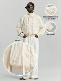 ONTREOntre Coupe-vent beige pour femme en nylon 100%, confortable et doux pour la peau, coupe ample en forme de O, petit col montant orné d'un lien, entièrement froncé, poches kangourou, ourlet élastique, veste à la mode idéale pour les occasions décontractées, professionnelles et de bureau, style urbain élégant et sophistiqué, collection de créateur de haute qualité, polyvalente pour toutes les saisons. #1 BEST-SELLERS