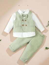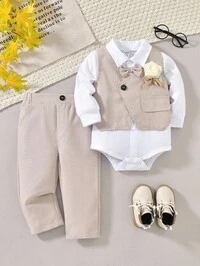 Fern GlowSHEIN 3 pièces Ensemble de tenue de gentleman pour bébé garçon, body blanc à manches longues, gilet gris beige et pantalon, style classique rétro confortable, chic et élégant, style britannique, convient pour l'intérieur, l'extérieur, le quotidien, les sports, les fêtes, les séances photo, les vacances, les festivals, les mariages, les baby-showers, Noël #4 BEST-SELLERS