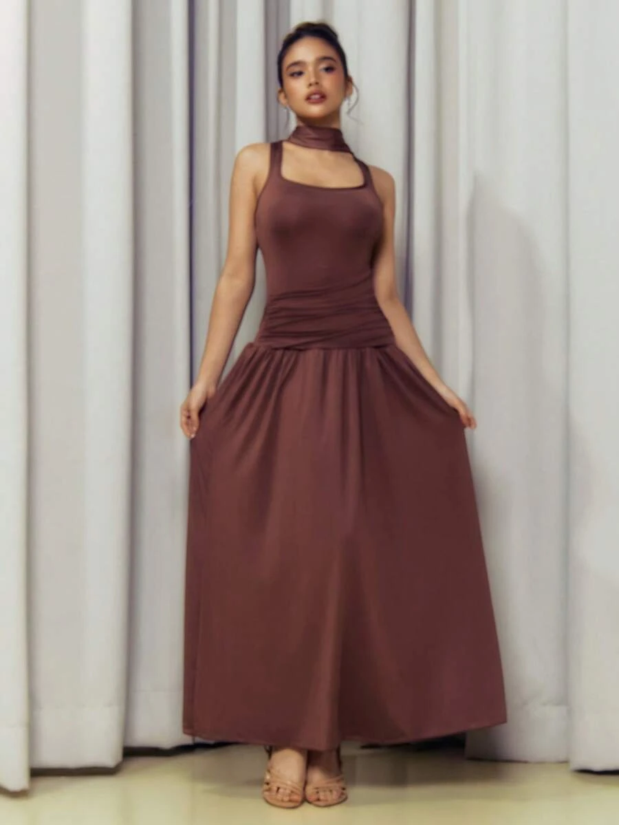 Criza Taa Robe longue asymétrique froncée marron sans manches avec épaules dénudées, tenues d'anniversaire pour femmes, tenues de soirée, robe d'invitée de mariage, tenue de concert, vêtements de rentrée scolaire, vêtements de début d'automne