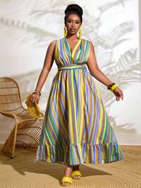 Veslaya 2026 Robe trapèze à dos croisé avec nœud papillon, colorbloc rayé, pour femmes grandes tailles. Idéale pour les festivals de musique, Pâques, style western, nomade, anniversaire, remise de diplômes, université, décontracté, vacances, croisière, plage, bronzage, streetwear, invitée de mariage, trajet, brunch, aéroport, soirée, banquet élégant, bal#1 BEST-SELLERS
