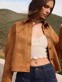 WESTFADE Veste en suédine synthétique boutonnée avec col, coutures western, cloutée. Idéale pour le printemps, l'été, les vacances, les stations balnéaires. Mignonne, décontractée, bohème. Parfaite pour Nashville, le style cowgirl, Stagecoach, Coachella, les festivals, le style western.