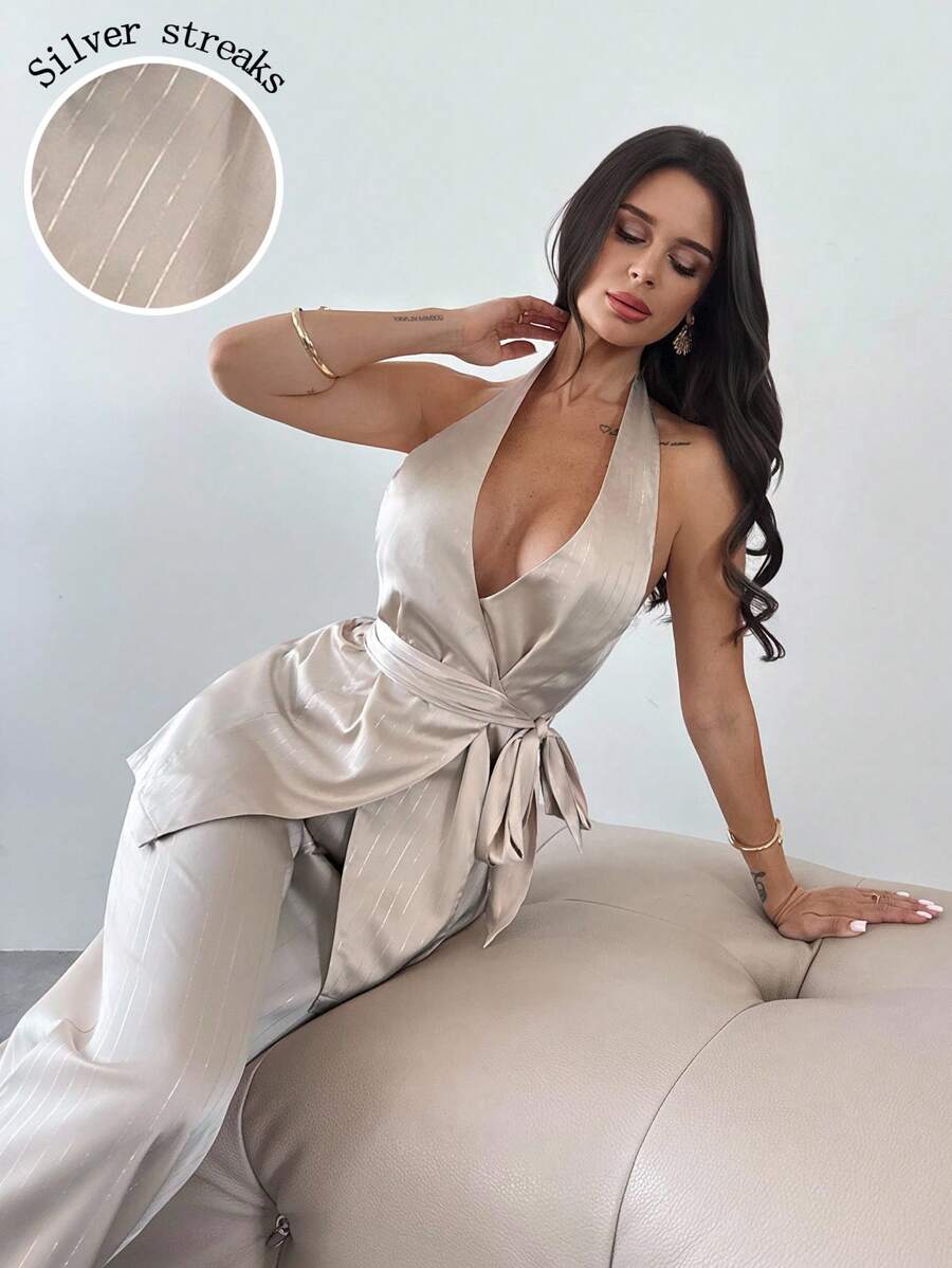 Firerie Ensemble femme pantalon large et Top dos nu à rayures pailletées. Tenue d'automne, retour à l'école, cérémonie, style décontracté chic, style old money, tenue de bureau, sortie, concert country, coquette, tenue de bureau, hors épaules, carreaux, .