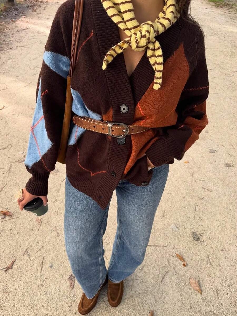 Cardigan femme élégant et polyvalent à manches longues, col en V, avec boutons et motif géométrique contrasté avec diamants. Grandes tailles