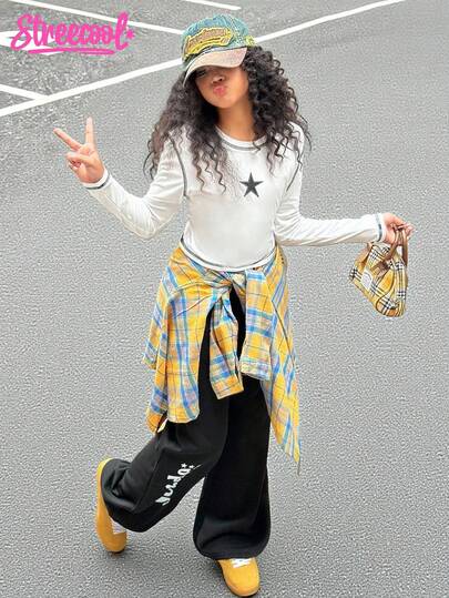 Ensemble 2 pièces fille avec Top à capuche à manches longues avec imprimé graphique lettres et pantalon, style décontracté en tricotunicolorei