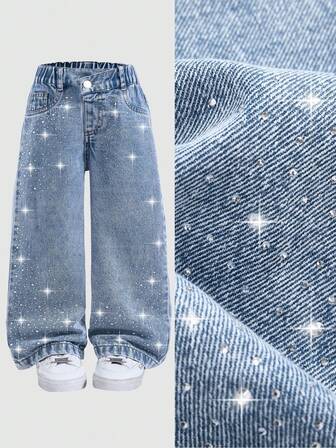 SHEIN Jeans pour jeunes filles, bleu moyen, style de rue décontracté pour les vacances, design Y2K, taille élastique asymétrique, poches de base, décoration de bouton-pression, ornements de strass, jambe droite ample, denim en coton doux, sans stretch, convient pour le port quotidien, les déplacements, les sorties, les fêtes, nouvelle arrivée pour l'automne/hiver