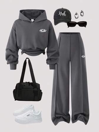 SHEIN Explorewe Ensemble 2 pièces pour jeunes filles : sweat-shirt à capuche épais style urbain + Leggings doublés thermiques, Décoration graphique numérique et lettre, Tenue douce et cool, Convient pour le casual, les sports, l'extérieur au printemps et à l'automne