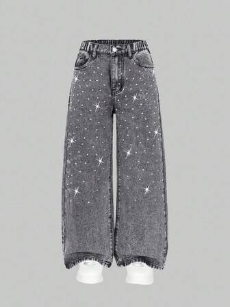 SHEIN ChillGRL Pantalon en jean large et décontracté gris à la mode pour préadolescentes, avec décorations de strass