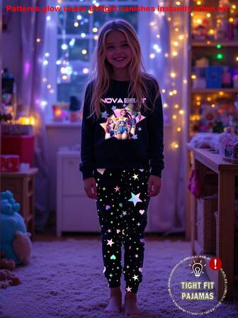 1 set Pyjamas qui brillent dans le noir pour préadolescentes - Top en tricot avec imprimé de groupe de filles violet luminescent activé par les UV et leggings en tricot avec imprimé d'étoiles et de cœurs, coupe ajustée (Remarque : Taille petite, envisager une taille supérieure)