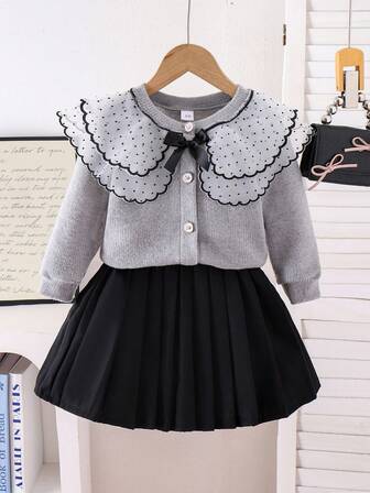 2 pièces Ensemble cardigan casual à pois et jupe plissée pour jeunes filles, printemps/automne
