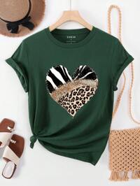 INAWLY T-shirt casual à col rond avec imprimé cœur léopard, manches courtes pour femmes